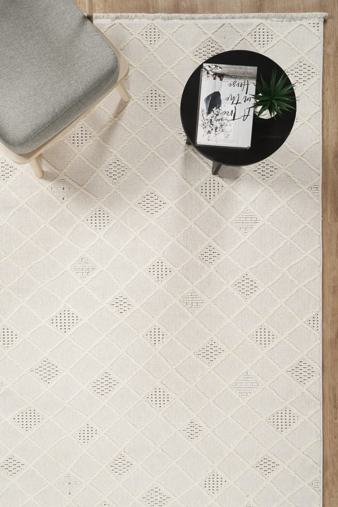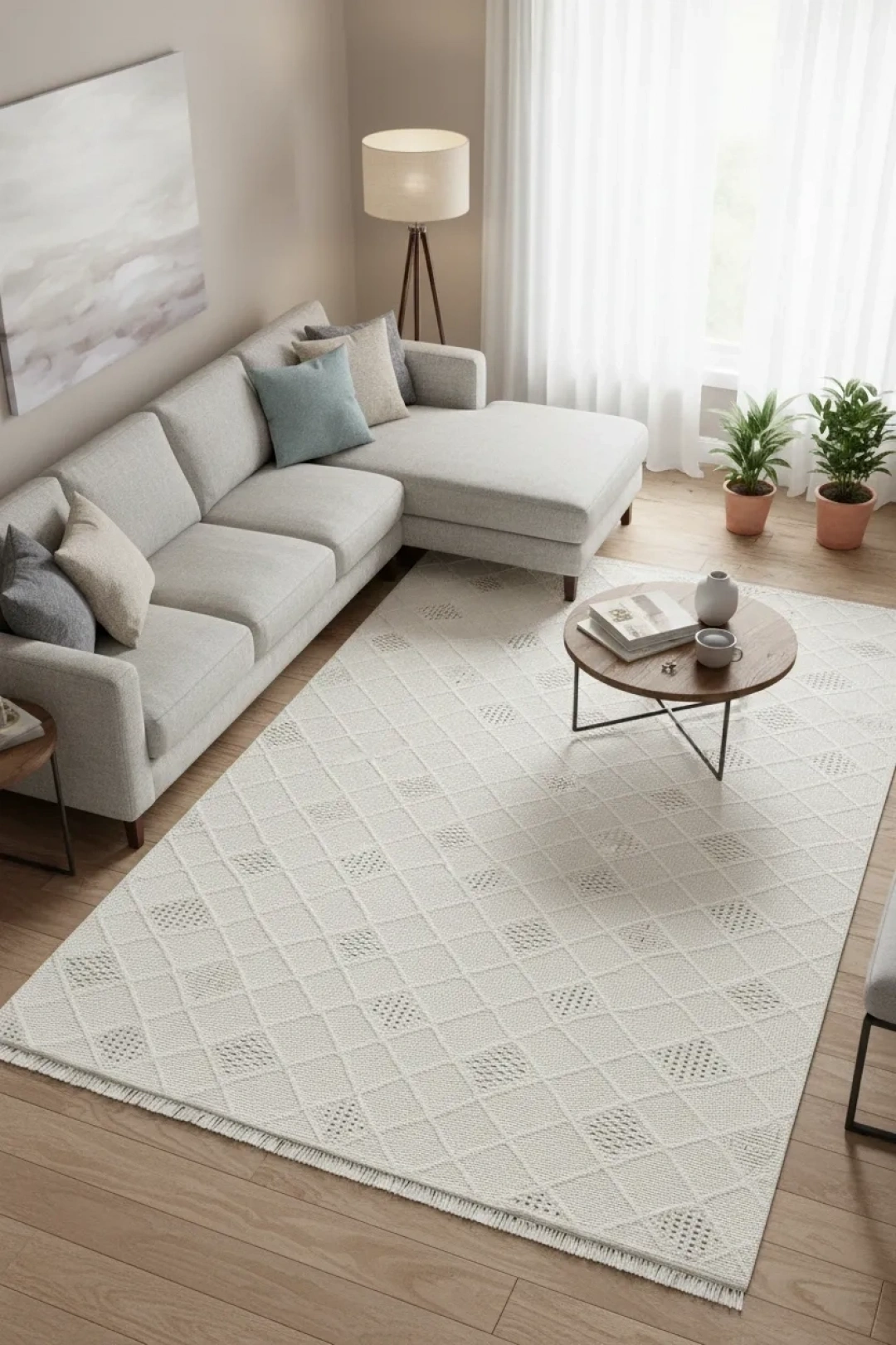 Desen: Elmas dokulu yüzey + simetrik örgü yapısıyla modern ve zamansız bir görünüm.