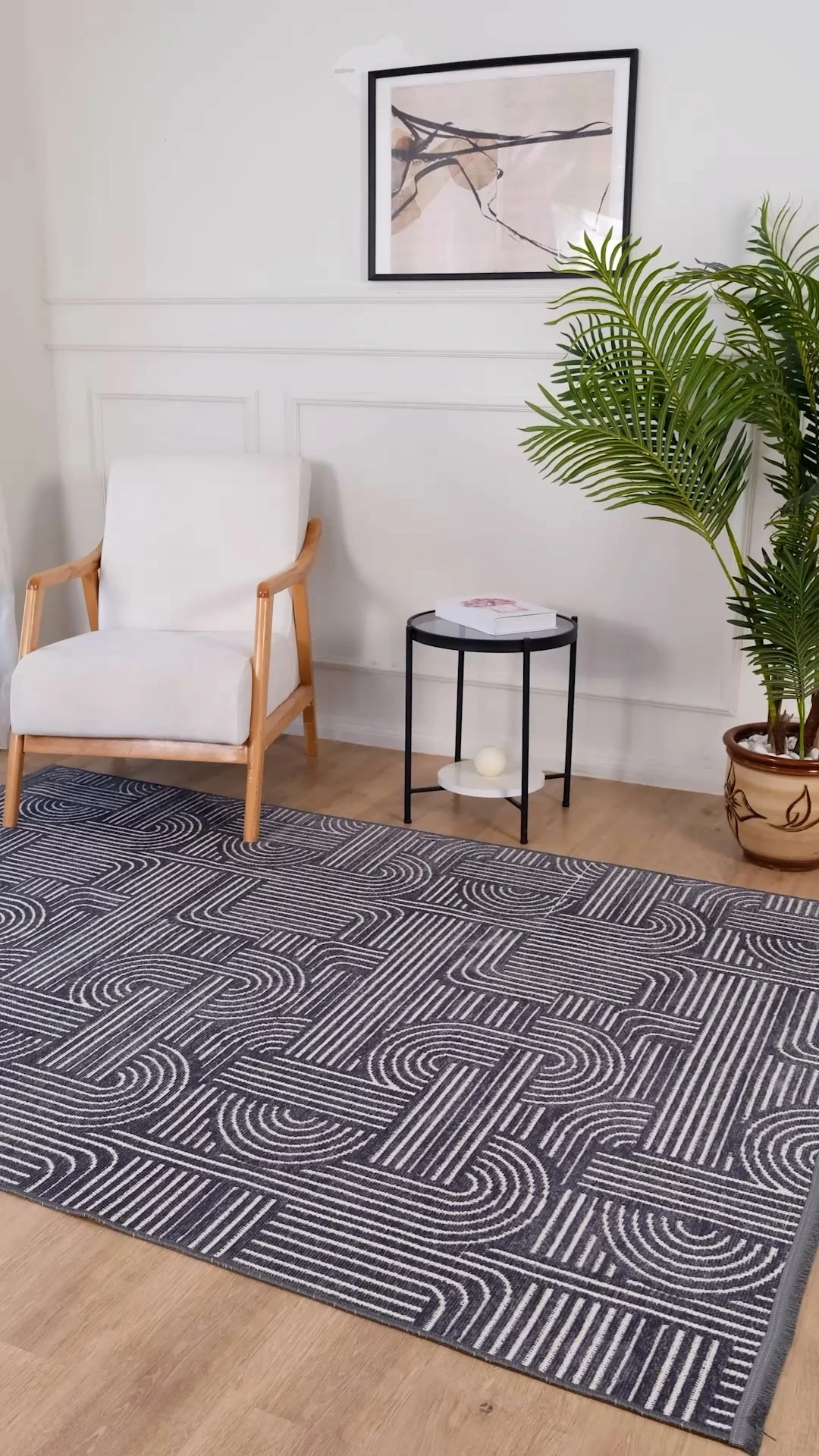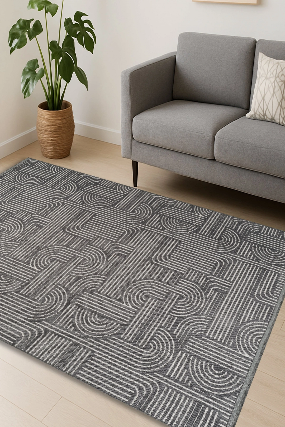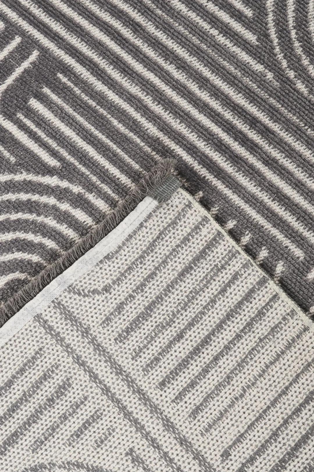Antrasit tonlarındaki geometrik desenler, hem modern hem bohem dekorasyonlara uyum sağlar. Halının ters yüzeydeki dokuma görünüm, kaliteyi ve el işçiliğini yansıtır.